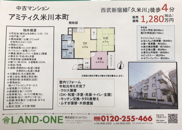 株式会社ランド・ワン > 株式会社ランド・ワンのブログ記事一覧 > オープンハウス アミティ久米川1,280万円